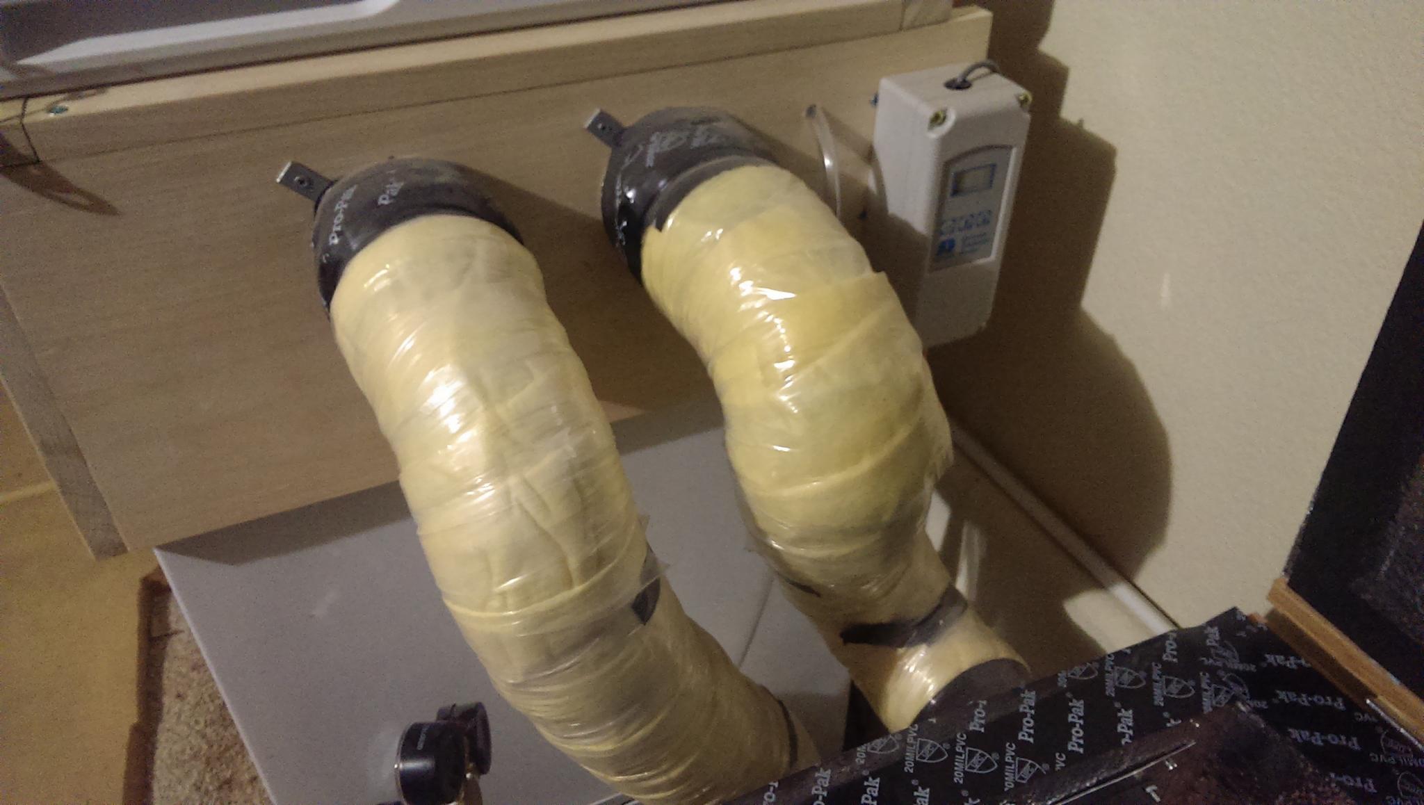 I came up with the idea that I would siphon the cold air out of the kegerator. Of course, it can't just be one way or it wouldn't work very well. The solution was to connect a fermentation chamber to the kegerator with 2 dryer hoses and circulate the air with standard 12V DC computer fans. I figured the pipes would be long enough that as long as the fans were not on it would have next to zero transfer of temperature.